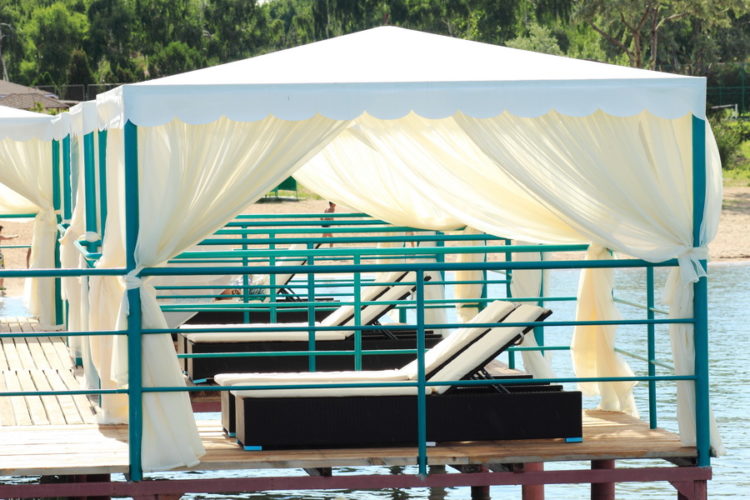 Собственный, песчаный, зонтики и шезлонги - бесплатно, пирс с шатрами, катамараны, скутера, бананы, дайвинг, парашют.